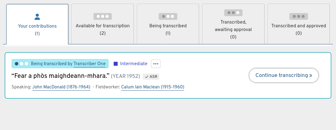 From that moment, the recording will be yours and yours only to work on. You can take as much time as you want to do the transcription, you do not have to do it all in one go. Whenever you come back to Opening the Well’s homepage, you will see your unfinished transcriptions under the Your contributions tab, and you can continue where you left off.