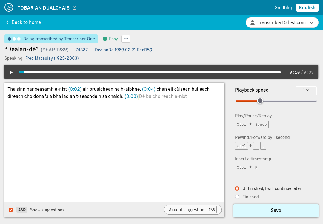 Opening the Well is a website where volunteers transcribe recordings in Scottish Gaelic. To become a volunteer transcriber you need to register first. Once you have registered you must log in using your e-mail address and password. Then you can start transcribing.