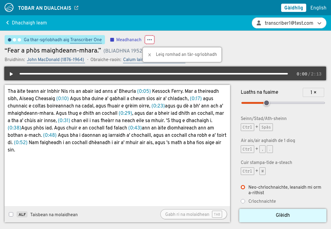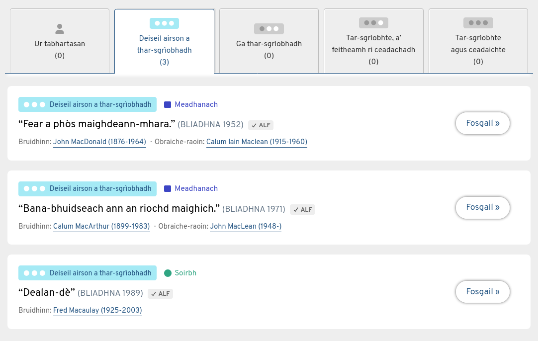 Cuimhnich nuair bhios clàradh air a cheangail riut nach eil duine sam bith eile comasach air obrachadh air. Ma bhios tu airson sgur dhe d' obrachadh air clàradh airson adhbhar sam bith, bu chòir dhut a thoirt air ais dhan na clàraidhean a tha rim fhaighinn, le bhith a' taghadh Leig romhad an tar-sgrìobhadh bhon chlàr-taice a thig am bàrr aig mullach na sgrìn.