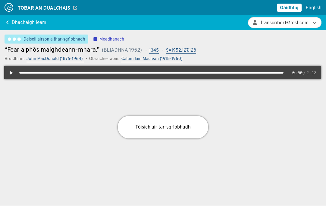 'S e tha ann an 'tar-sgrìobhadh' ach èisteachd ris na chanar an ann clàradh fuaim agus a sgrìobhadh sìos - anns a' bhogsa teacsa mhòr gheal. 'S e an dòigh as fheàrr airson sin a dhèanamh ach mean air mhean: bidh thu ag èisteachd airson beagan diogan, a' stad na cluiche, a' sgrìobhadh sìos na chuala tu, agus an uair sin a' leantainn ort fad beagan diogan eile - agus mar sin air adhart. Seo mar as urrainn dhut tòiseachadh: