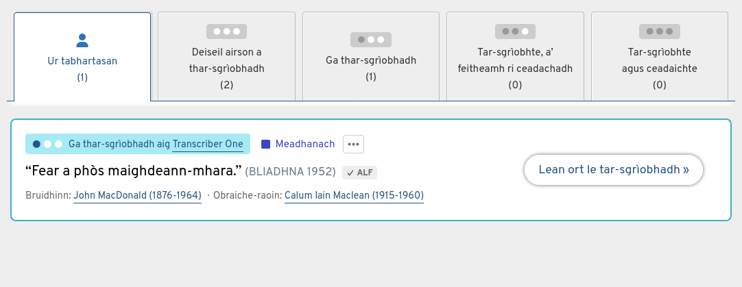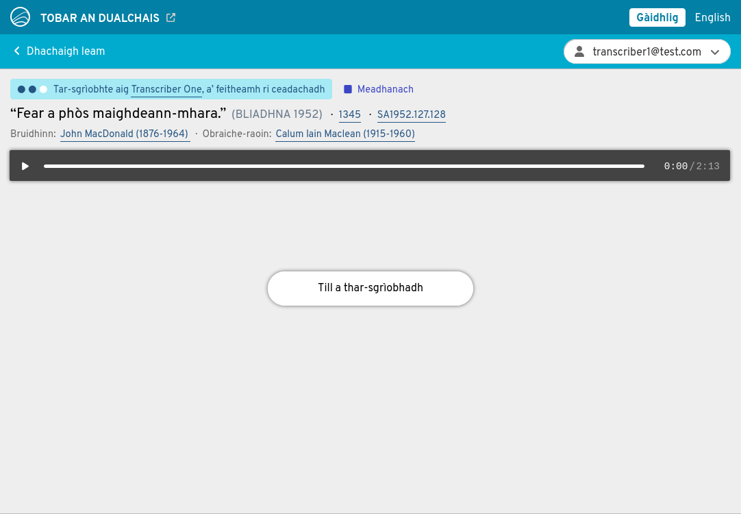 Bhon uair sin, bidh an clàradh agad fhèin a-mhàin agus is tu an aon neach a dh'obraicheas air. Faodaidh tu gabhail air do shocair gus an tar-sgrìobhadh a choileanadh; chan fheum thu a dhèanamh bho cheann gu ceann aig aon àm. Ge brith cuin a thilleas tu gu duilleag-dhachaigh Fosgladh an Tobair, chì thu na tar-sgrìobhaidhean neo-chrìochnaichte agad fon taba Ur tabhartasan, agus faodaidh tu leantainn ort far an do stad thu roimhe.