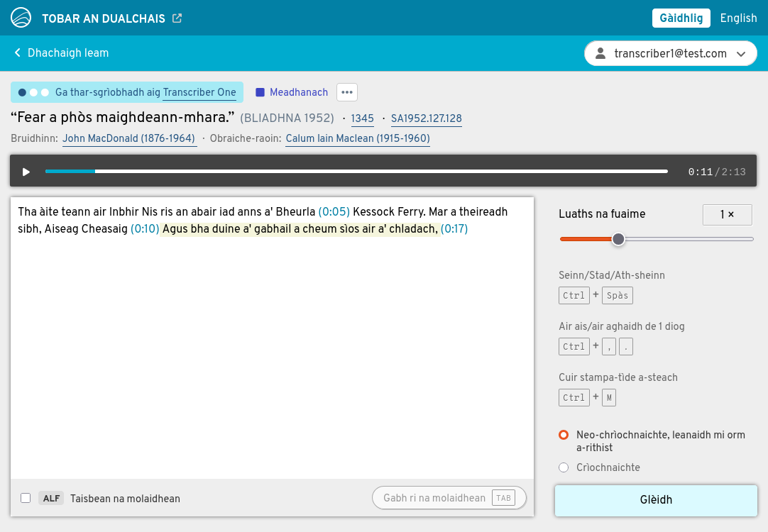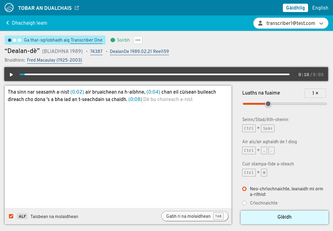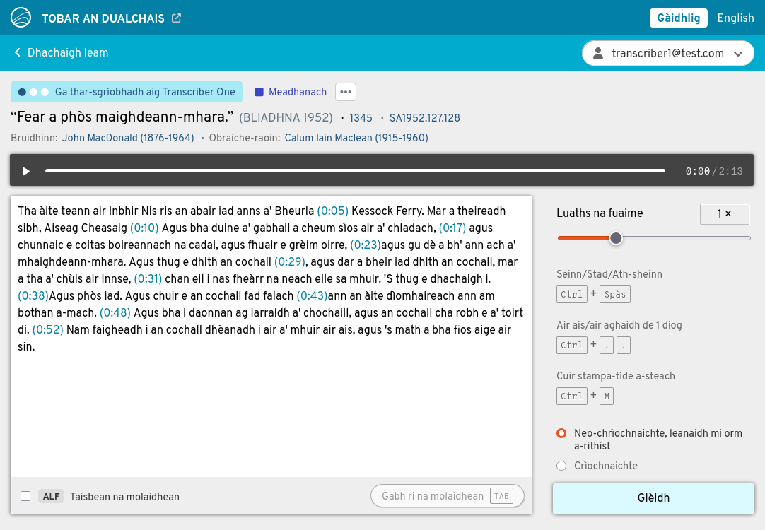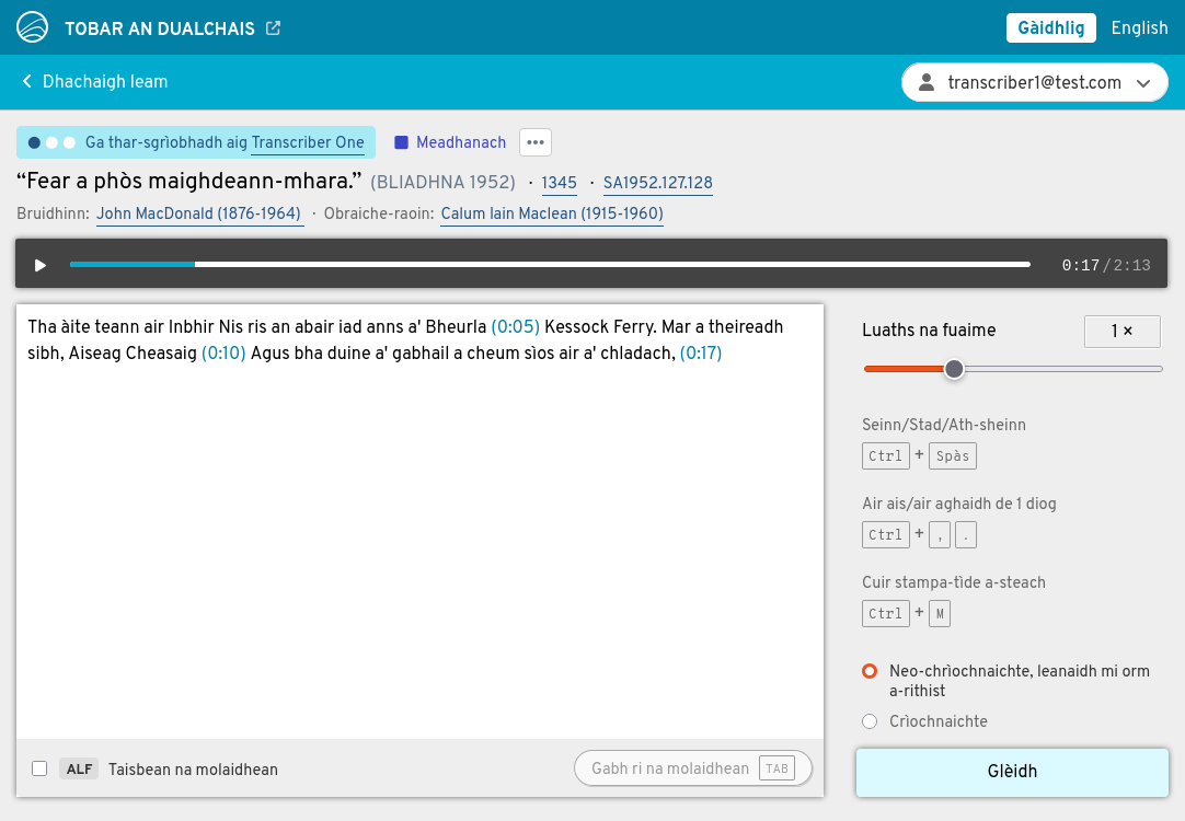 Tha dà adhbhar aig na tar-sgrìobhaidhean agad. Air aon làimh, cuidichidh iad daoine gus na clàraidhean air prìomh làrach Tobar an Dualchais a thuigsinn 's a mhealtainn. Air an làimh eile, thèid an cleachdadh gus teicneòlas cànain Gàidhlig a thrèanadh, leithid aithneachadh labhairte fèin-ghluasadach. Air sgàth seo, tha e cudromach faclan nan luchd-labhairt a thar-sgrìobhadh dìreach mar a chluinneas tu iad, gun mhearachdan gràmair a cheartachadh agus gun fhaclan dualchainnteach a "àbhaisteachadh".